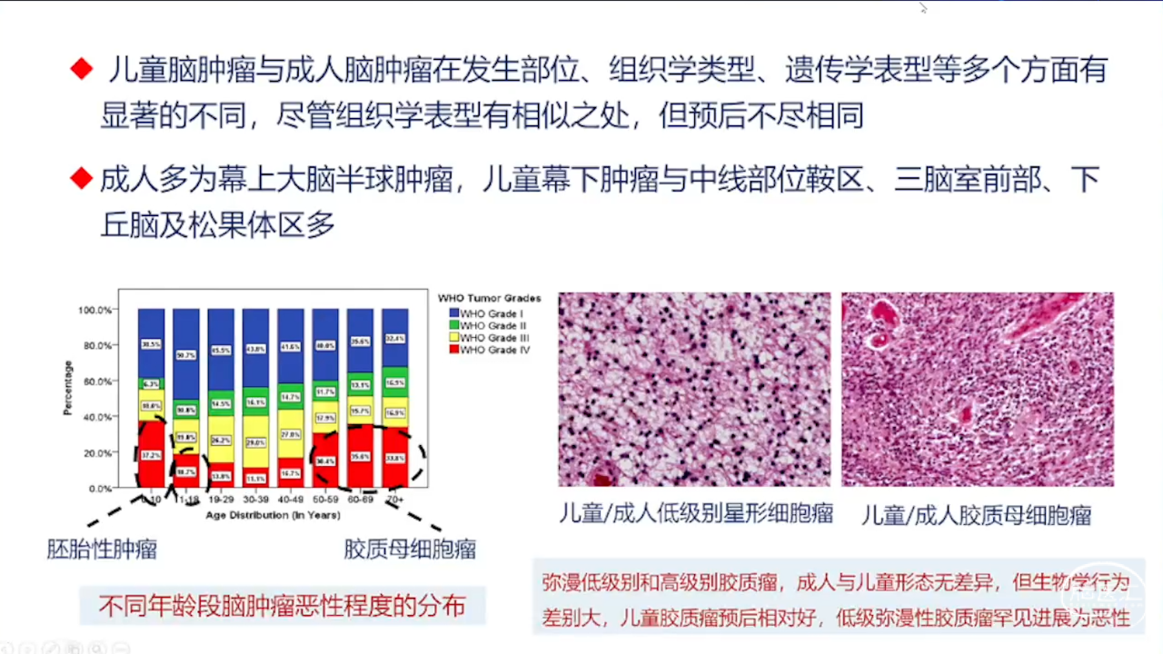 儿童脑肿瘤与成人脑肿瘤在发生部位、组织学类型、遗传学表型等多个方面有显著的不同,尽管组织学表型有相似之处,但预后不尽相同。成人多为幕上大脑半球肿瘤,儿童幕下肿瘤与中线部位鞍区、三脑室前部、下丘脑及松果体区多。