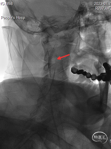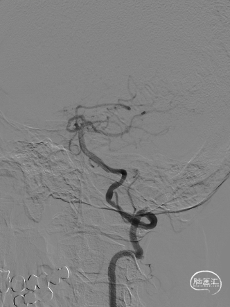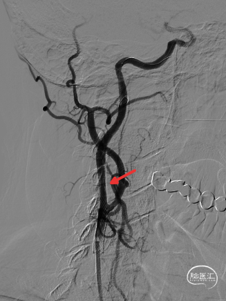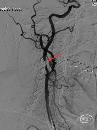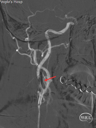 撤出保护伞观察10分钟复查造影,无弹性回缩,狭窄明显好转,血流明显改善(箭头处),结束手术。