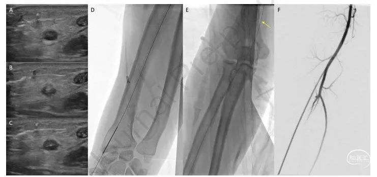 图2.成功放置经桡动脉鞘的桡动脉闭塞患者示例。使用超声识别闭塞的桡动脉(A),该动脉不会搏动并且缺乏彩色多普勒信号,但必须进行测量以确认其足够大以容纳所需的鞘。使用单壁21g穿刺针在与传统桡动脉通路相同的解剖位置刺穿血管腔(B、D)。由于在进入管腔时不会提供血液回流的反馈,因此必须在超声上清楚地看到针尖在血管腔内(B)。然后,将一根0.021英寸的微导丝穿过闭塞的动脉并进入肱动脉(C、D、E箭头)。在超声上观察血管腔内的微导丝以确认导丝通过管腔(C)。根据研究者经验,所需的鞘必须为23厘米,最大直径可达8Fr,然后将鞘通过导丝送入肱动脉,随后进行血管造影以确认鞘的正确放置(F)。