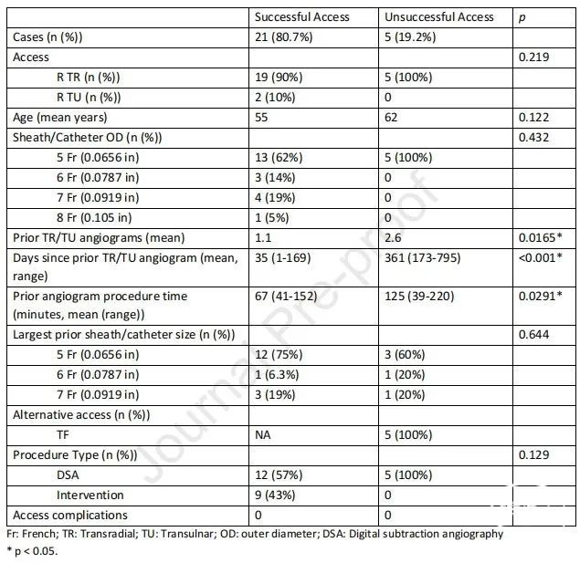 表1.经桡或经尺入路成功与失败病例总结。