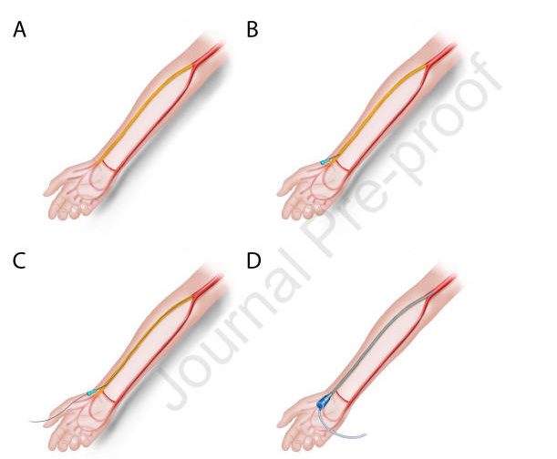图1.桡动脉闭塞再次置管技术。一旦确定桡动脉闭塞(A)并且具有足够的口径放置鞘,以与桡动脉未闭相同的方式确定手腕中的穿刺部位。无需过度穿刺近端或远端以找到通畅区域;相反,无论血管闭塞如何,穿刺都应位于解剖学上适合放置鞘的部位。在超声引导下,使用单壁21g针刺穿血管(B),并通过闭塞处将0.021英寸的微导丝送入肱动脉(C),然后将鞘通过微导丝送入肱动脉(D),即可遇到快速回流的血液。