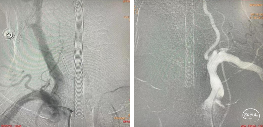 支架释放后,工作位造影血流通畅。