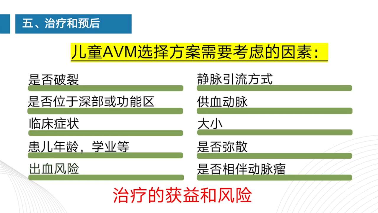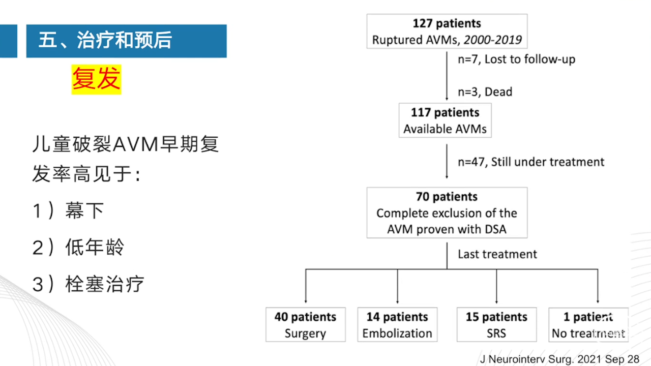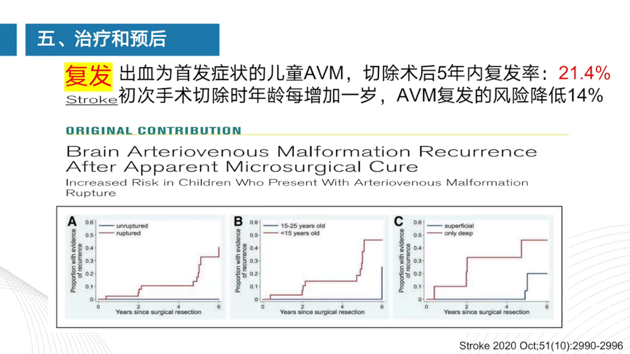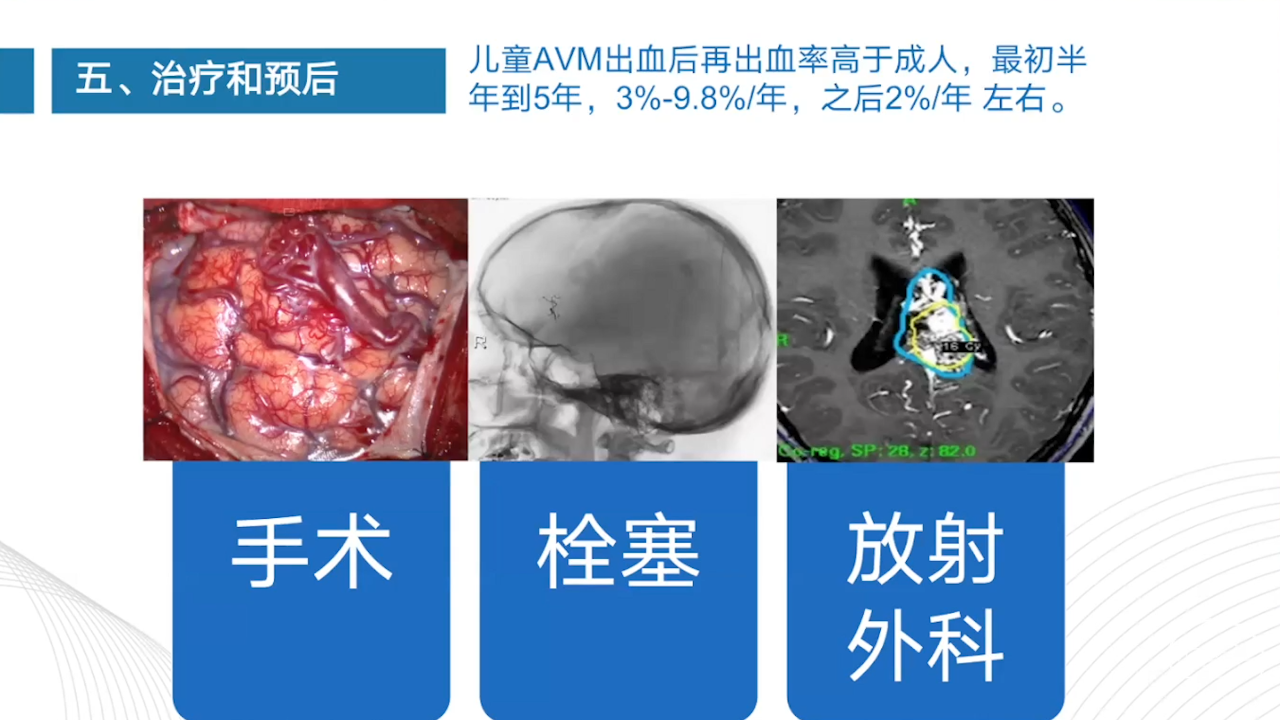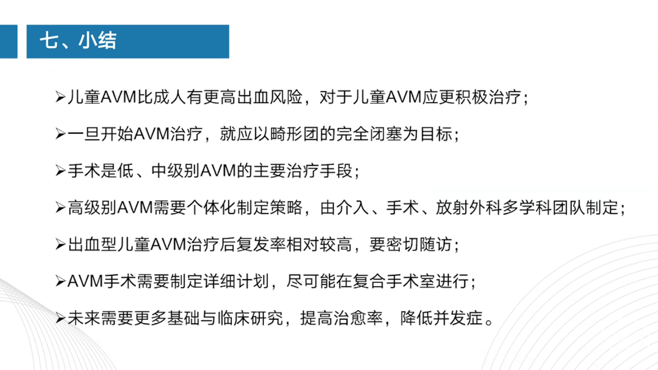 儿童AVM比成人有更高出血风险,对于儿童AVM应更积极治疗。一旦开始AVM治疗,就应以畸形团的完全闭塞为目标。手术是低、中级别AVM的主要治疗手段。高级别AVM需要个体化制定策略,由介入、手术、放射外科多学科团队制定。出血型儿童AVM治疗后复发率相对较高,要密切随访。AVM手术需要制定详细计划,尽可能在复合手术室进行。未来需要更多基础与临床研究,提高治愈率,降低并发症。