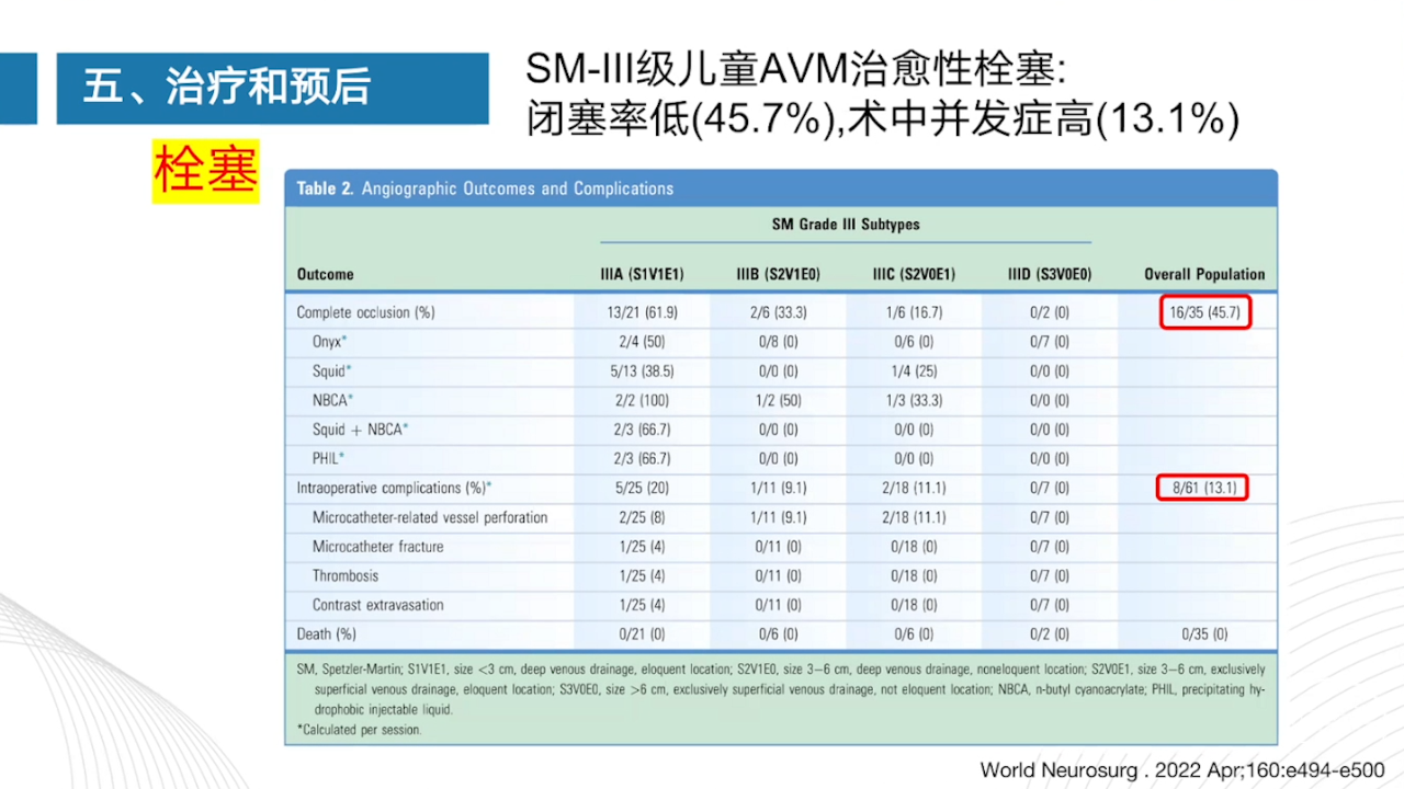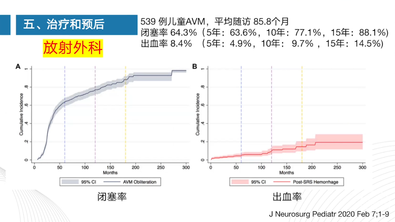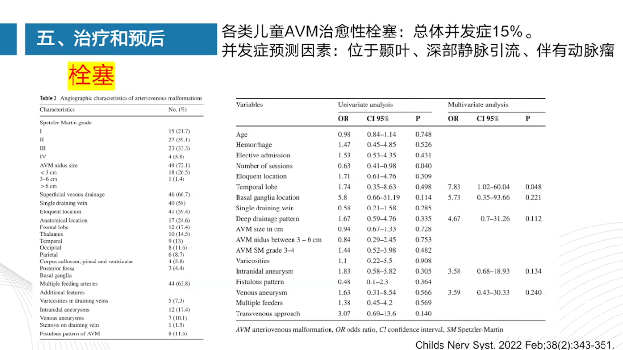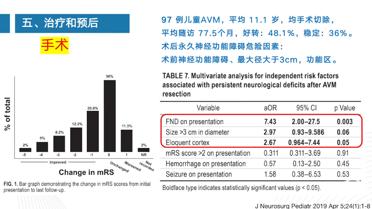 儿童AVM比成人有更高出血风险,对于儿童AVM应更积极治疗。一旦开始AVM治疗,就应以畸形团的完全闭塞为目标。手术是低、中级别AVM的主要治疗手段。高级别AVM需要个体化制定策略,由介入、手术、放射外科多学科团队制定。出血型儿童AVM治疗后复发率相对较高,要密切随访。AVM手术需要制定详细计划,尽可能在复合手术室进行。未来需要更多基础与临床研究,提高治愈率,降低并发症。