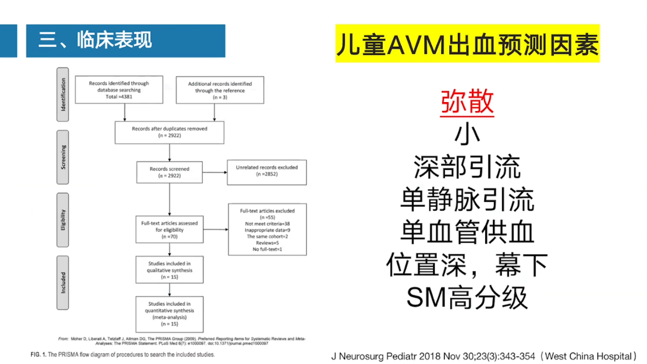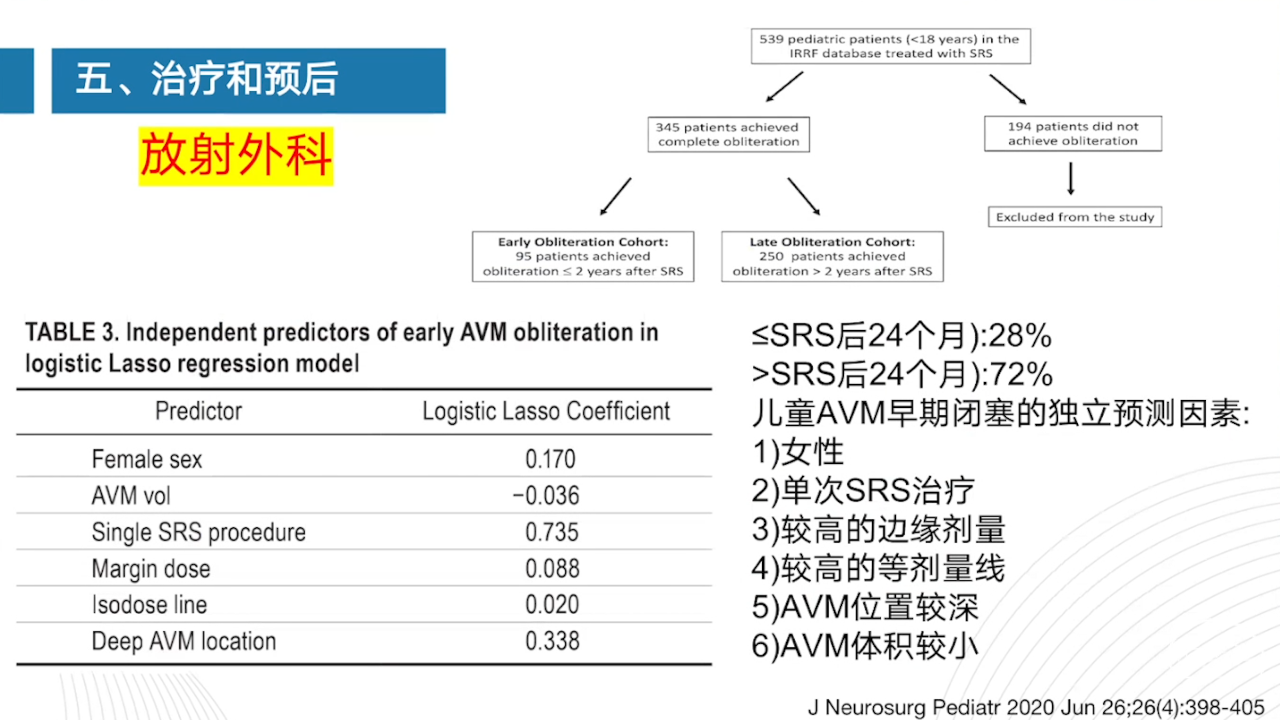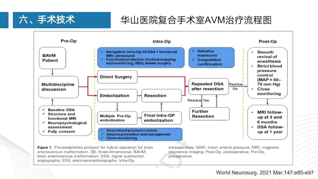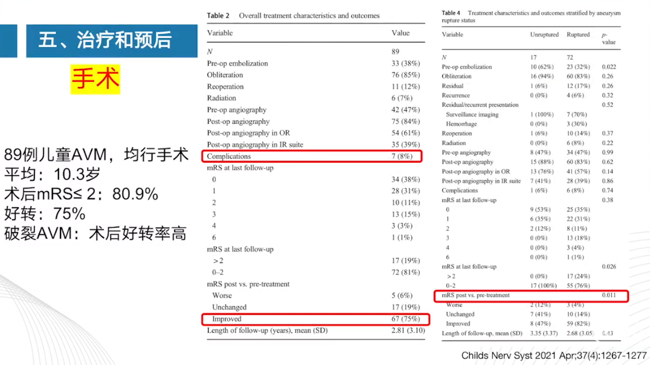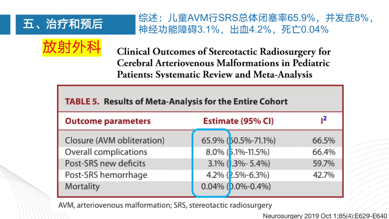 儿童AVM比成人有更高出血风险,对于儿童AVM应更积极治疗。一旦开始AVM治疗,就应以畸形团的完全闭塞为目标。手术是低、中级别AVM的主要治疗手段。高级别AVM需要个体化制定策略,由介入、手术、放射外科多学科团队制定。出血型儿童AVM治疗后复发率相对较高,要密切随访。AVM手术需要制定详细计划,尽可能在复合手术室进行。未来需要更多基础与临床研究,提高治愈率,降低并发症。