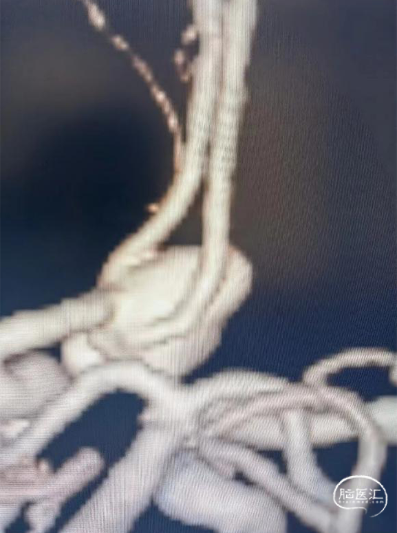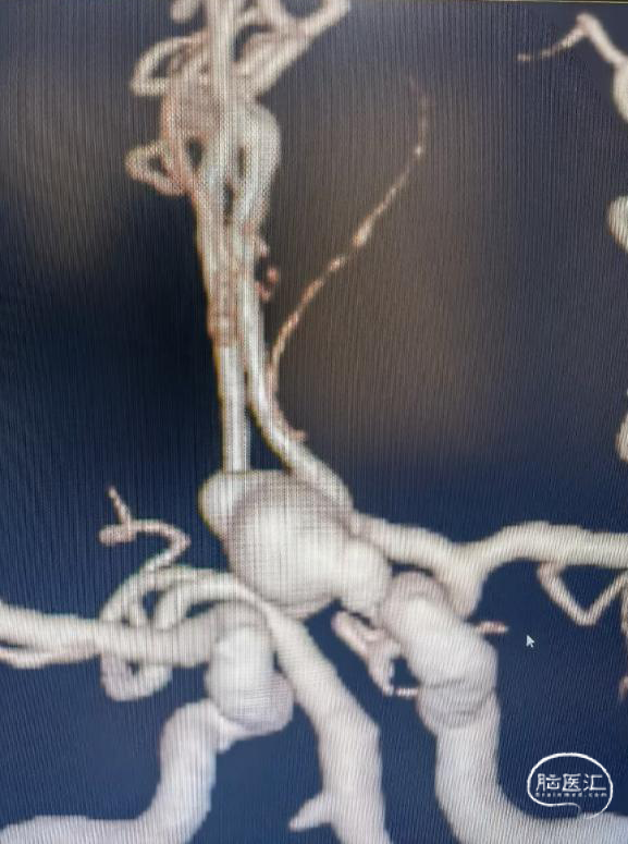 CTA:见前交通动脉瘤,大脑前动脉共干,动脉瘤16*10*9大小,双侧A2均由动脉瘤上发出,右侧A2开口呈180°回旋。