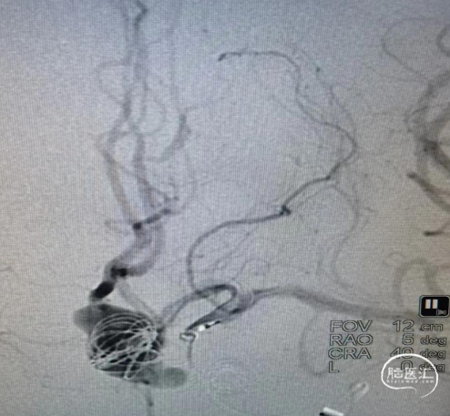 遂小心撤出微导丝,再次复查造影,显影如前。以血管缝合器缝合右股动脉,常规加压包扎。术毕,全麻清醒如术前,安返病房。