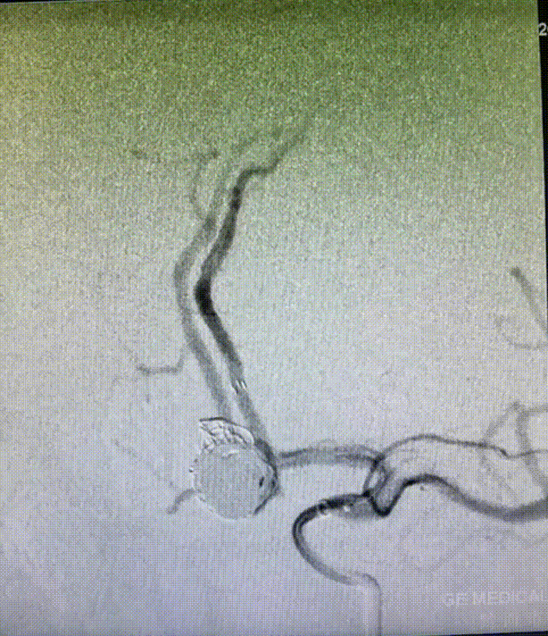 2、超滑导丝结合5F多功能导管进入右颈内动脉,在导管支撑下将6F输送导管引入颈内动脉C1远段(鞘管内持续肝素盐水点滴,浓度:肝素50mg/500ml 0.9% NS)。