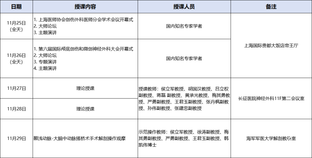 2. 理论授课:颅底血管解剖、颅底血管重建技术、卒中血管重建、原位血管重建及颞浅动脉-大脑中动脉搭桥术等在临床的应用(长征医院神经外科11F小会议室)。
