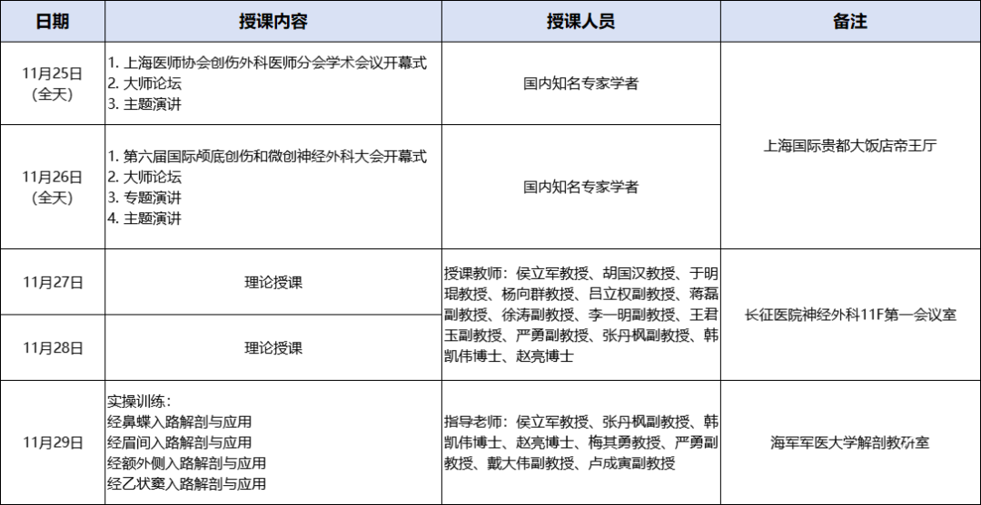 2. 理论授课:颅底临床应用解剖、颅底神经内镜的5种基本手术入路和4种特殊入路等技术在临床中的应用(长征医院神经外科11F第一会议室)。