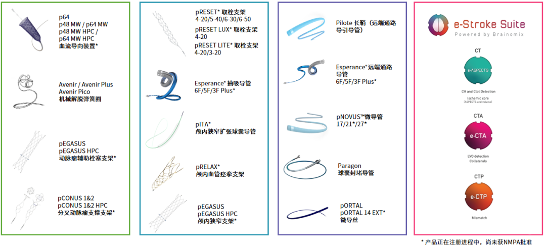 如今,沃比医疗提供的卒中整体解决方案覆盖出血性卒中、缺血性卒中和通路三大领域。已上市产品包括Avenir家族机械解脱弹簧圈、p64/p48血流导向装置、pEGASUS弹簧圈辅助栓塞支架、pCONUS分叉动脉瘤栓塞植入装置、Esperance®抽吸导管、pRESET取栓支架、Esperance®远端通路导管、pNOVUS™17微导管、Pilote™远端通路导管(长鞘)和Paragon球囊导引导管等。