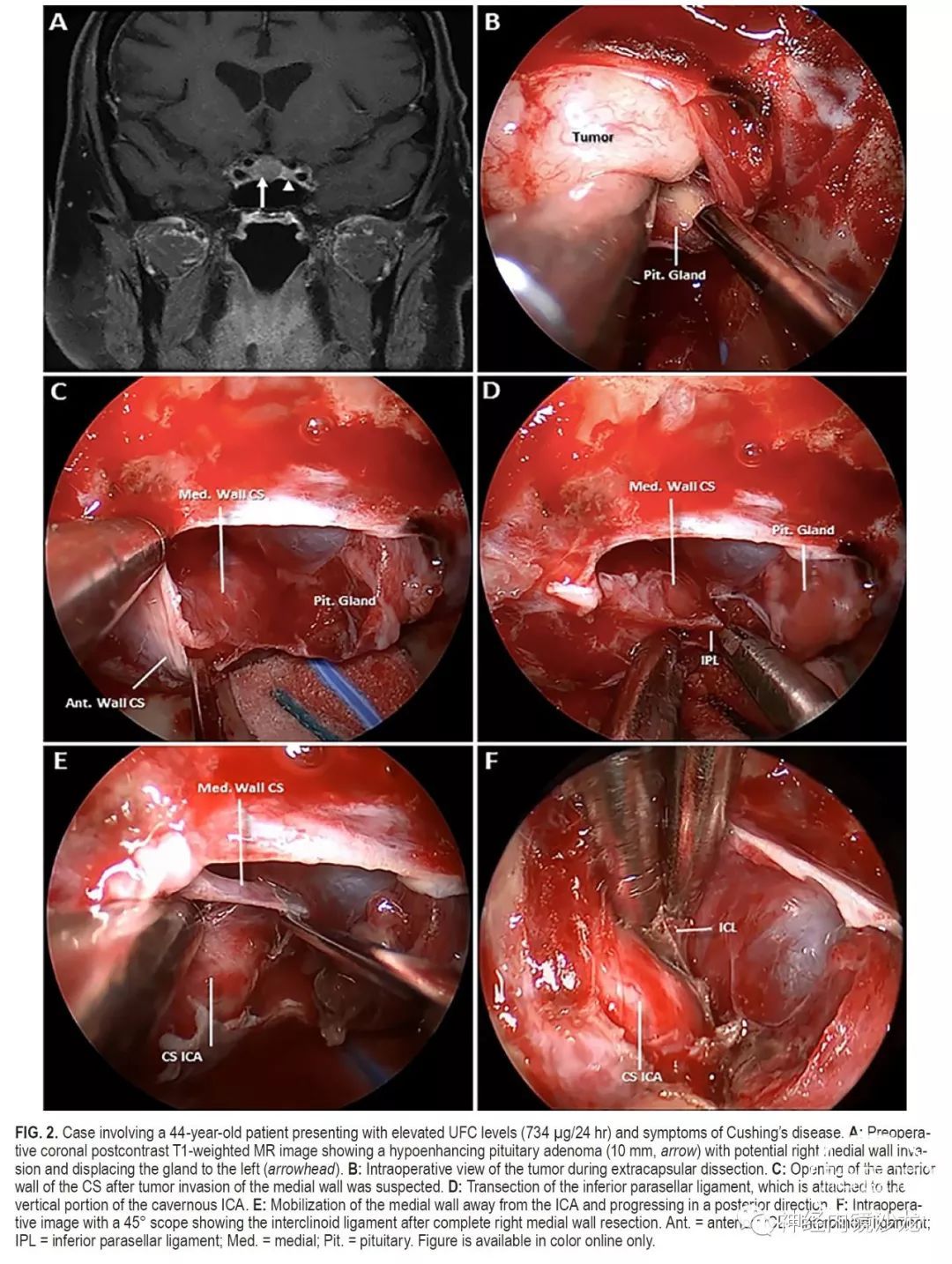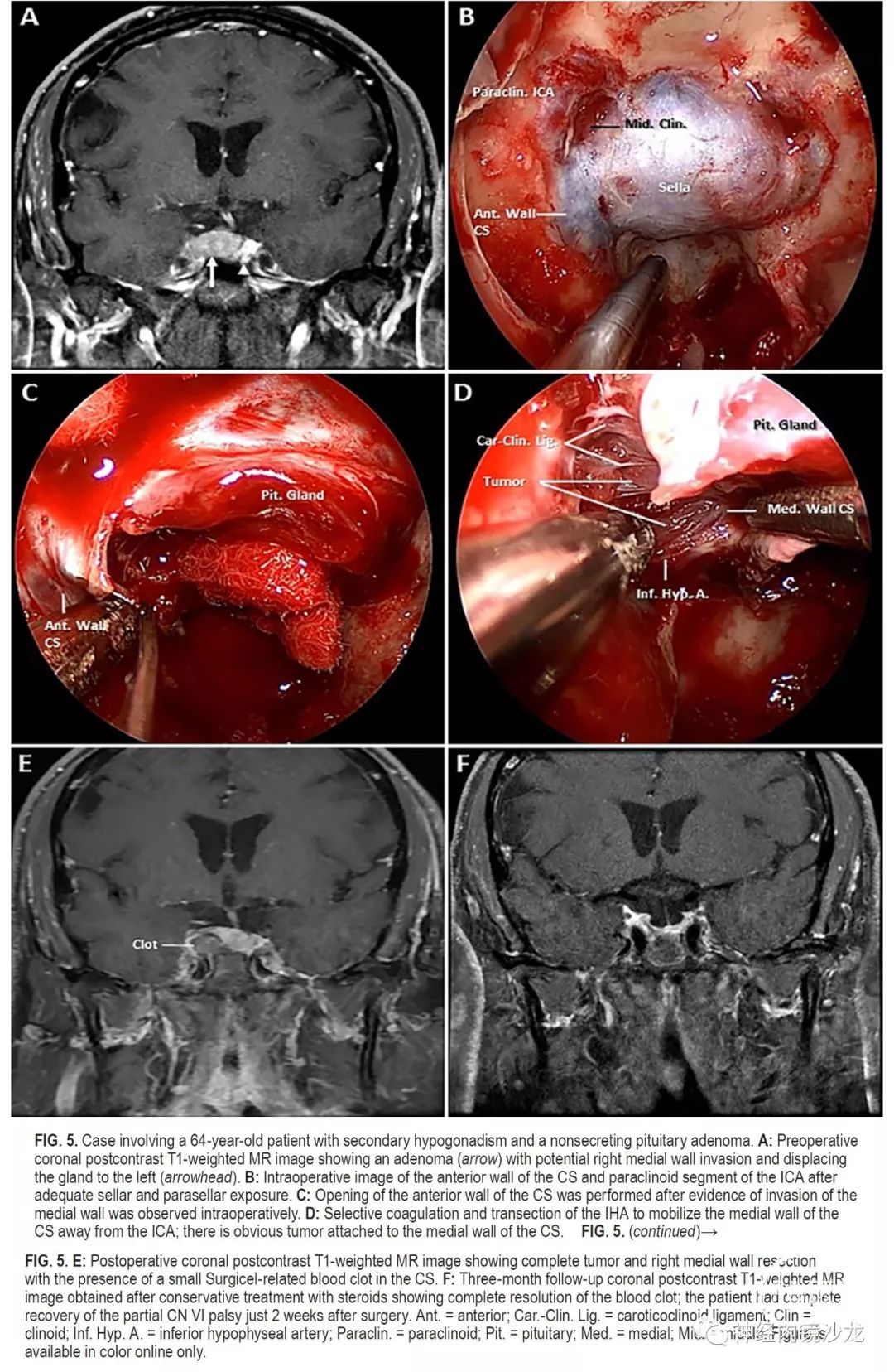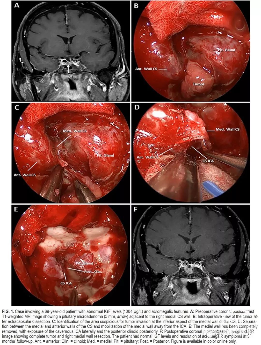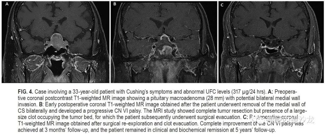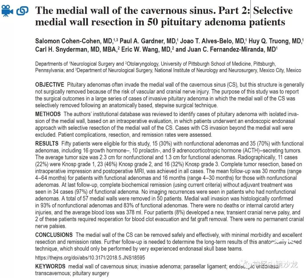 结论:海绵窦内侧壁可以安全有效地切除,并发症低,完全切除和症状缓解率极佳。这种基于解剖学的手术技术的长期疗效,需要更多随访数据进一步确定。该技术只能由非常有经验的鼻内镜颅底团队进行。