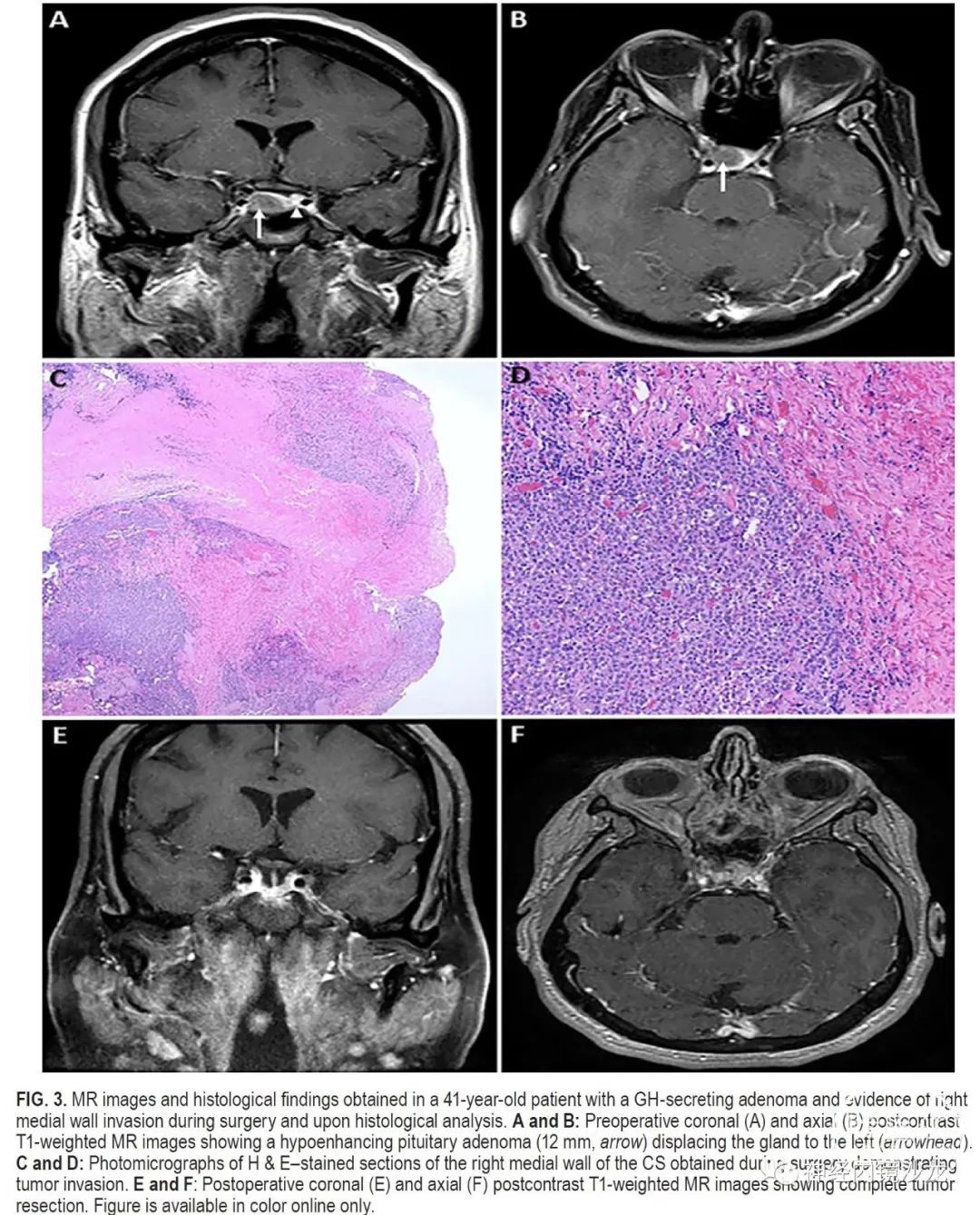 结果:50例患者符合本研究的条件,15例(30%)非功能性腺瘤和35例(70%)功能性腺瘤;包括16例生长激素、10例催乳素和9例促肾上腺皮质激素(ACTH)腺瘤。非功能性腺瘤的平均肿瘤大小为2.3cm,功能性腺瘤的平均肿瘤大小为1.3cm。放射学检查,11例(22%)为Knosp 1级,23例(46%)Knosp 2级,16例(32%)Knosp 3级。根据术中判断和术后MRI,所有病例均实现肿瘤全切。对于功能性腺瘤患者,平均随访时间为30个月(范围4-64个月),对于非功能性腺瘤患者,平均随访时间为16个月(范围4-30个月)。根据最后一次随访结果,34例(97%)功能性腺瘤未采用辅助治疗即获得完全生化缓解(使用现行标准)。非功能性腺瘤的患者,未见影像学复发。50名患者中共切除了57侧内侧壁。组织学证实,93%的非功能性腺瘤和83%的功能性腺瘤中存在内侧壁侵袭。没有死亡或颈内动脉损伤病例,平均失血量为378ml。4名患者(8%)出现新发短暂性颅神经麻痹,其中2名患者需要再次手术清除血凝块和脂肪填塞物。未出现永久性颅神经麻痹。
