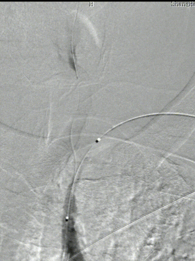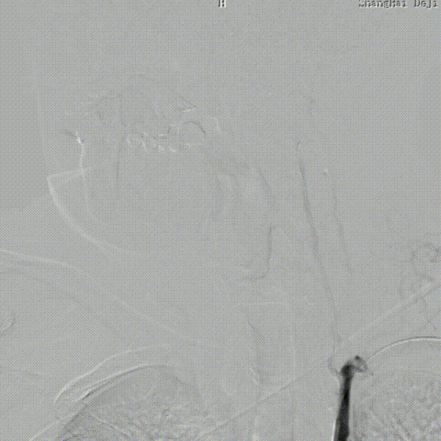 造影见LV闭塞,立即沿0.014*200cm 通桥北斗SS™神经血管导丝置入3mm*16mm 药物球扩支架至LV1。