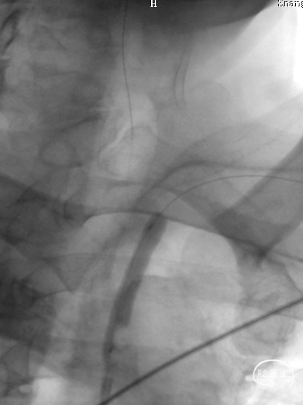 再次沿0.018*300cm 外周导丝送入6*40 外周球囊达LSub狭窄部位,压力泵逐渐加压到8atm,见残余狭窄20%。