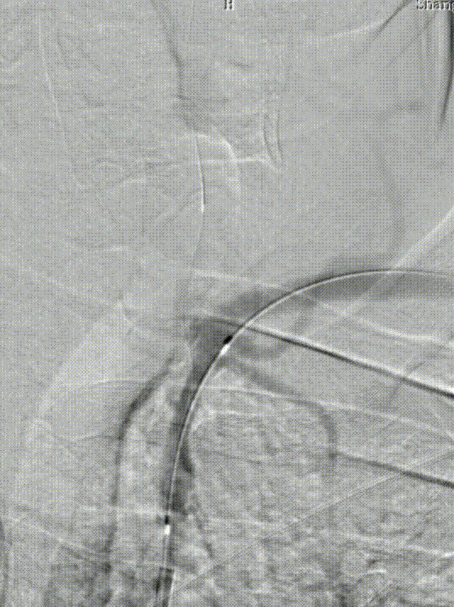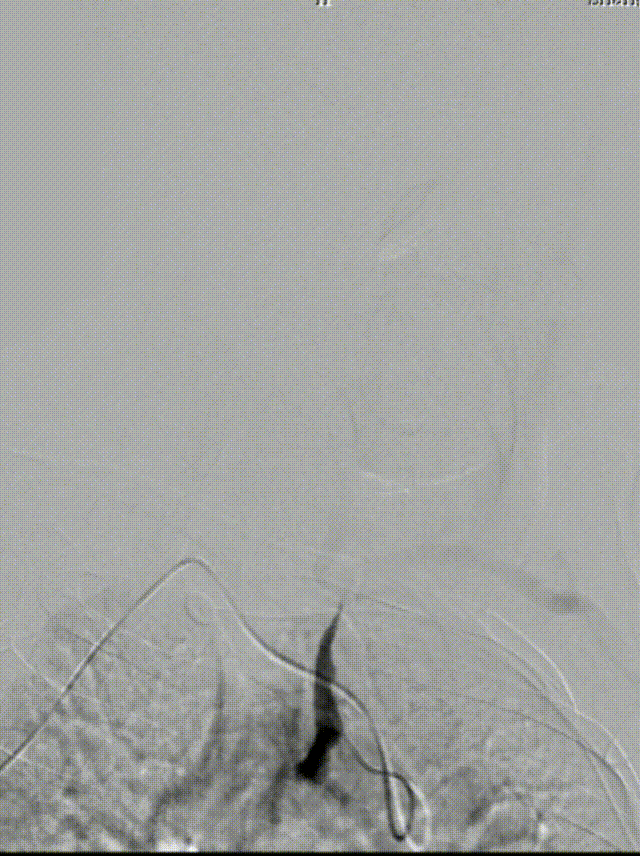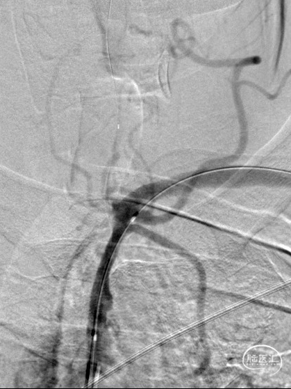 患者锁骨下动脉及椎动脉串联狭窄,术中扩张锁骨下动脉时出现椎动脉栓塞,术中不排除椎开口新形成血栓,若保护椎动脉导丝提前从左桡进入,椎动脉支架提前放置在椎开口附近,可更迅速植入支架,可能会减少术中形成血栓风险。