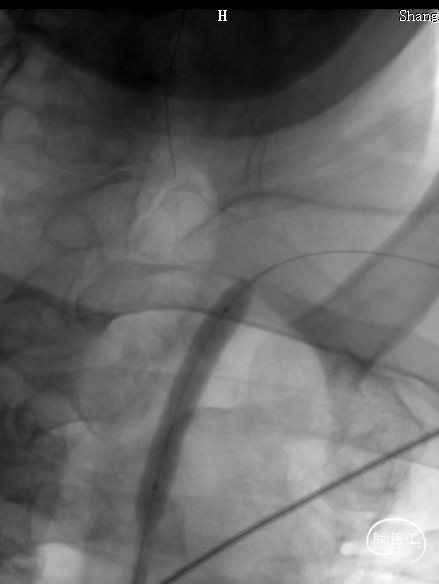 沿0.018*300cm 外周导丝送入6*40 外周球囊送至左侧锁骨下动脉狭窄处,压力泵逐渐加压到6atm。