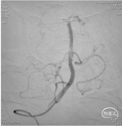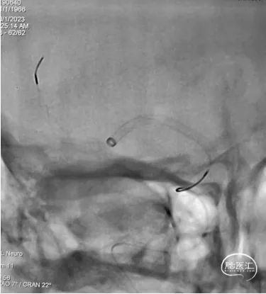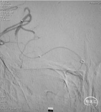 微导丝配合微导管沿颅内血栓抽吸导管小心通过右侧大脑中动脉血栓段,微导管造影示右侧大脑中动脉远端血流通畅。