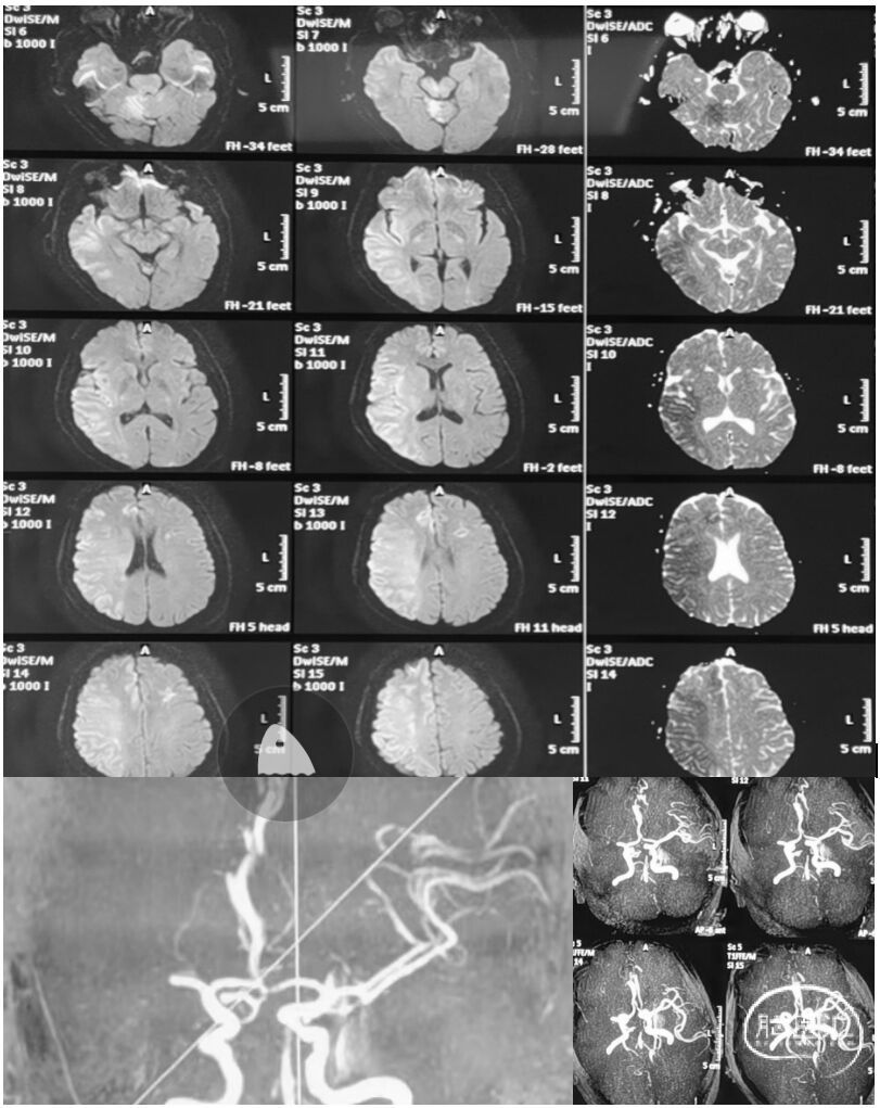 辅助检查:头颅MRI+MRA示:双侧小脑半球、右侧大脑半球多发急性期脑梗塞,右侧大脑中动脉重度狭窄或闭塞改变。
