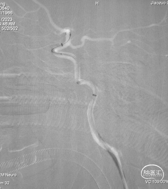 6F心玮吞川®颅内血栓抽吸导管同轴配合8F心玮天梯®支撑导管在泥鳅导丝导引下放置于右侧颈内动脉眼段。