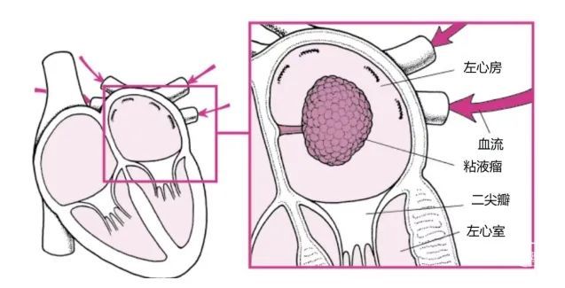 瓣膜处梗阻。粘液瘤的主体通常长在一根茎上,可以随血液流动和心脏收缩在心腔内来回摆动。如果粘液瘤进入瓣膜开口,它会暂时影响、甚至阻断通过瓣膜的血液流动,可以产生血压波动、晕厥,甚至危及生命的严重后果。这通常发生在左心房和左心室之间的心脏瓣膜——二尖瓣。