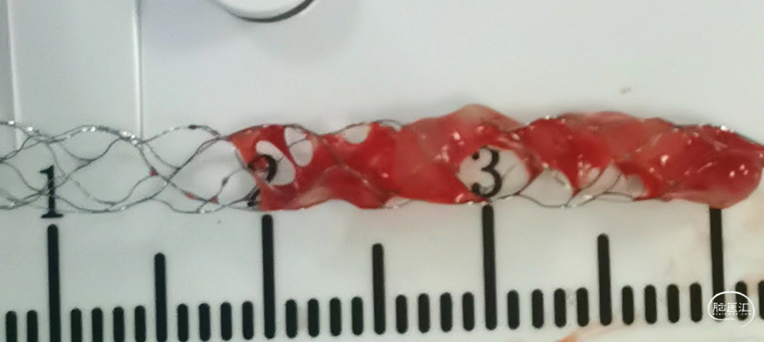 复查造影示基底动脉及其分支显影良好,取栓装置中可见白色胶冻状血栓。