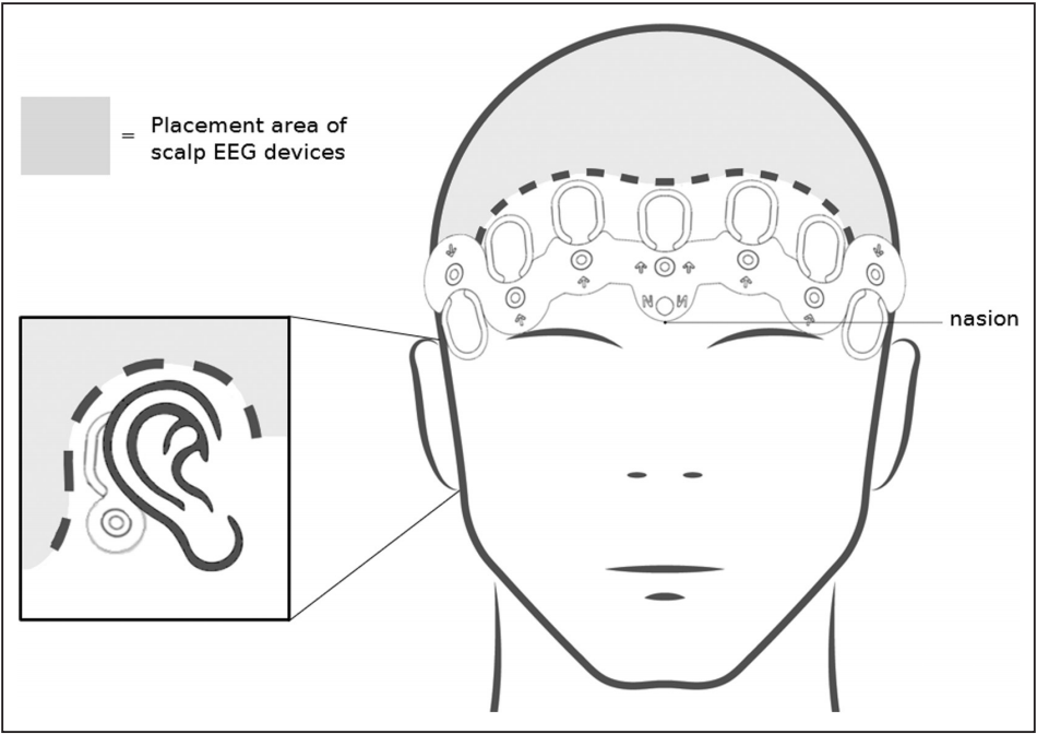 图1. 发际线(虚线)下方的脑电图电极安置。