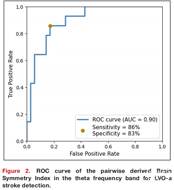 本研究包括疑似卒中或已确诊为LVO-a卒中的成年患者,且症状发作时间少于24小时。在进行血管内血栓切除术前,在急诊科使用位于前额和耳后的9个自粘电极记录了3分钟的脑电图。研究运用受试者工作特征曲线(ROC)分析,评估了频带功率(frequency band power)和成对导出的脑对称性指数(pairwise derived Brain Symmetry Index)这两种量化的脑电特征在诊断LVO-a卒中方面的准确性。