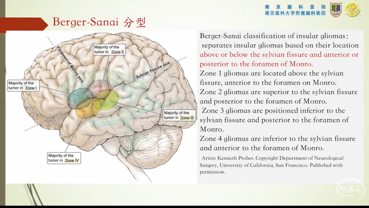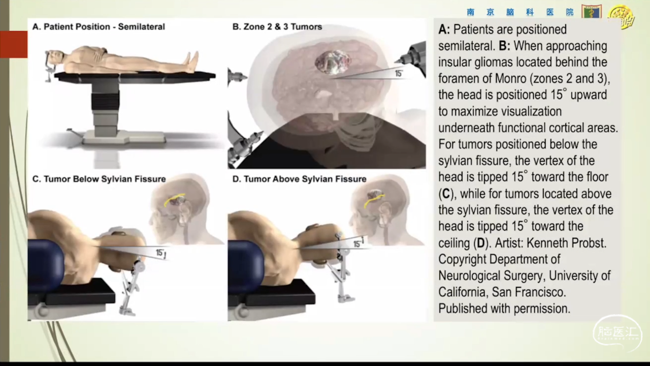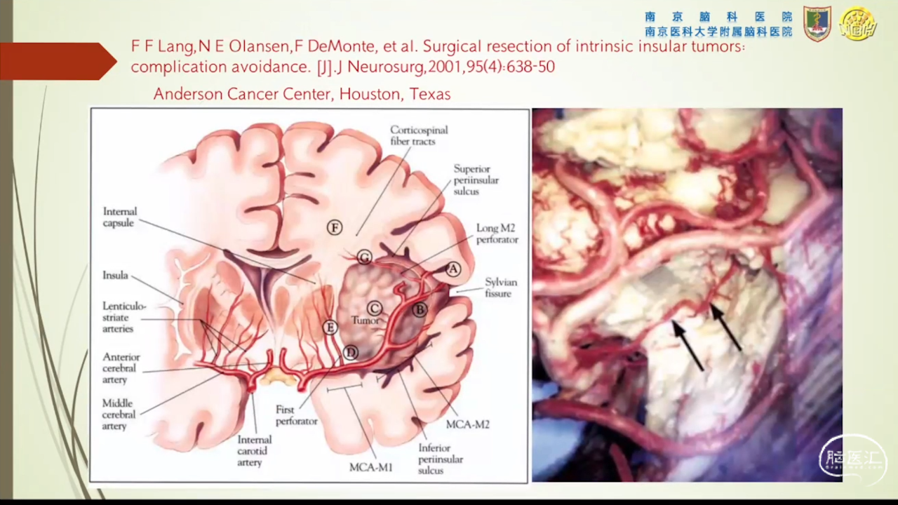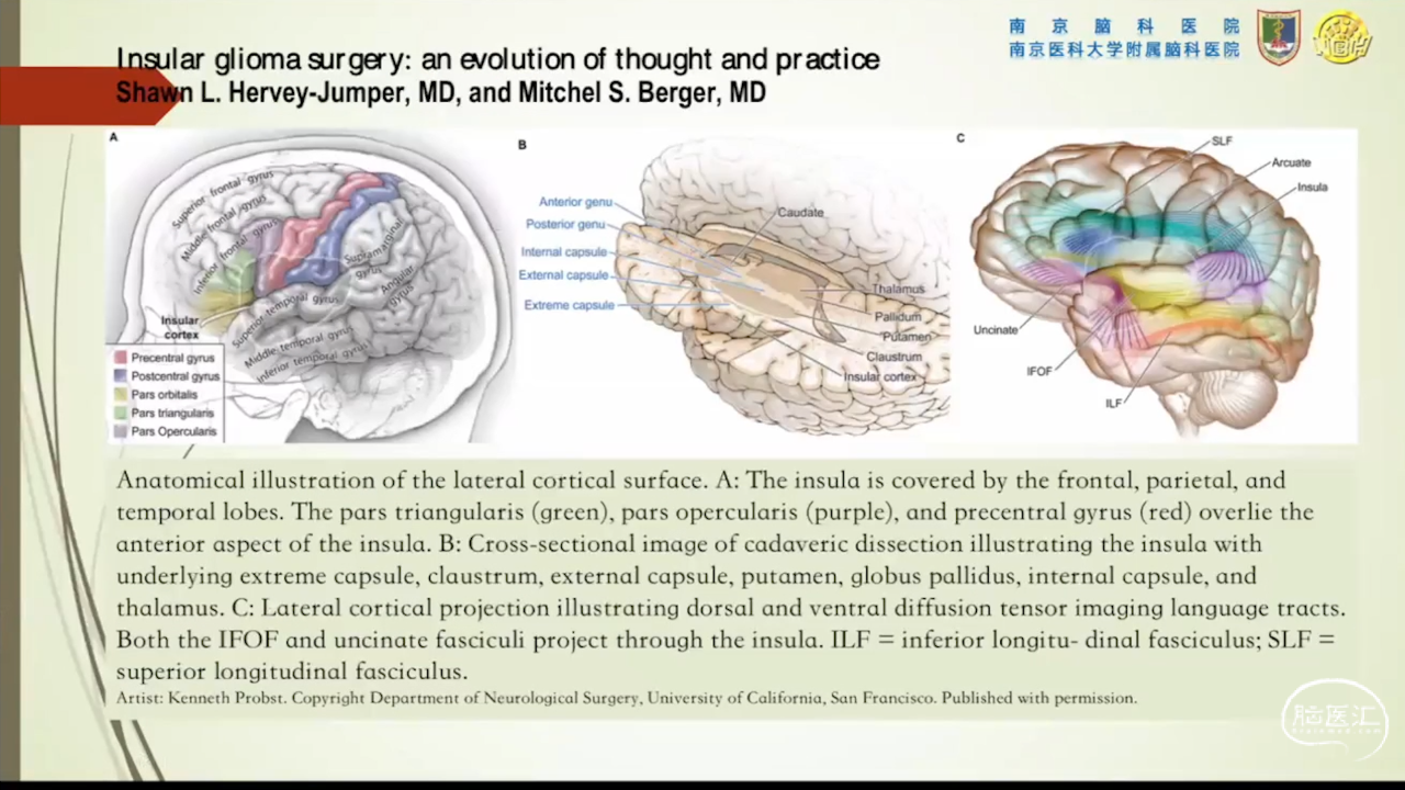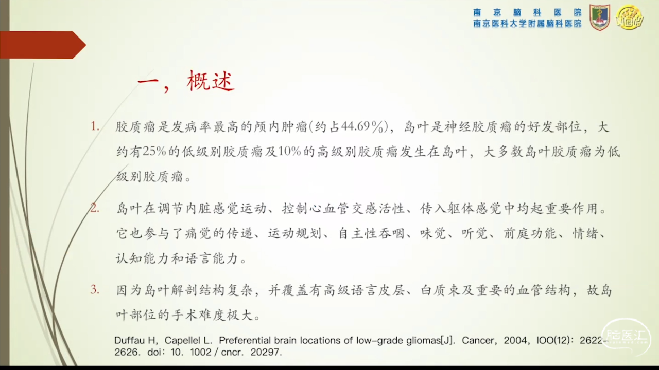 胶质瘤是发病率最高的颅内肿瘤(约占44.69%),岛叶是神经胶质瘤的好发部位,大约有25%的低级别胶质瘤及10%的高级别胶质瘤发生在岛叶,大多数岛叶胶质瘤为低级别胶质瘤。岛叶在调节内脏感觉运动、控制心血管交感活性、传入躯体感觉中均起重要作用。它也参与了痛觉的传递、运动规划、自主性吞咽、味觉、听觉、前庭功能、情绪、认知能力和语言能力。因为岛叶解剖结构复杂,并覆盖有高级语言皮层、白质束及重要的血管结构,故岛叶部位的手术难度极大。
