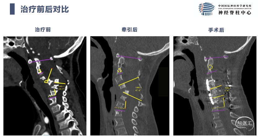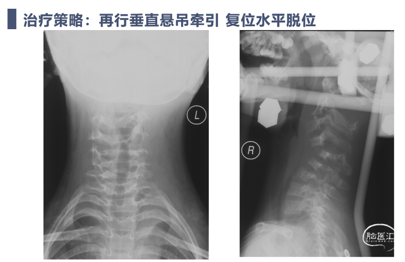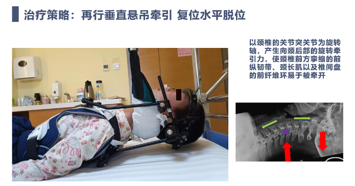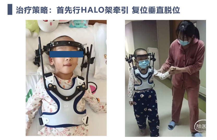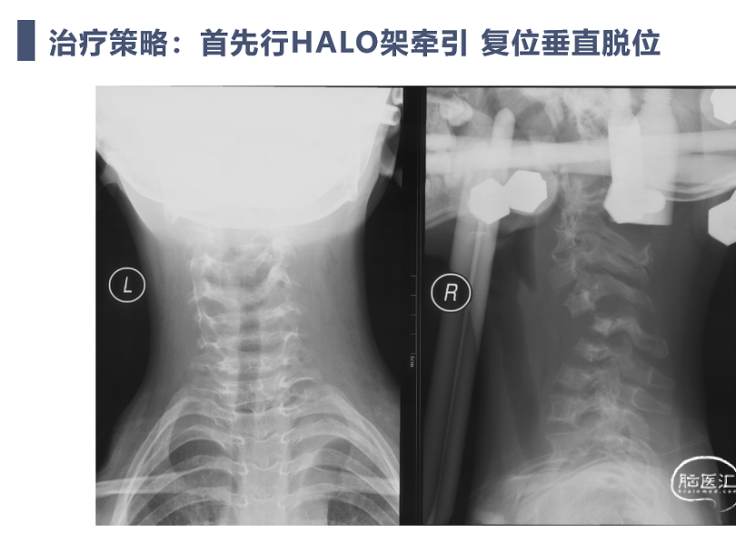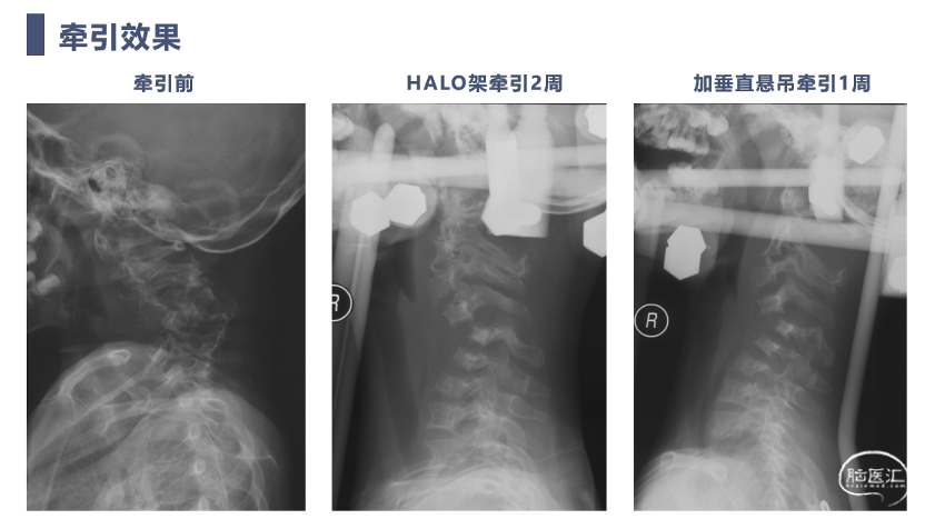 对于此种重度畸形的患者,术前牵引非常重要,为此我们首先选择HALO架牵引复位垂直脱位,患者可以自由活动,舒适度好。在牵引后期进一步行悬吊牵引,复位水平脱位。