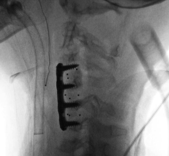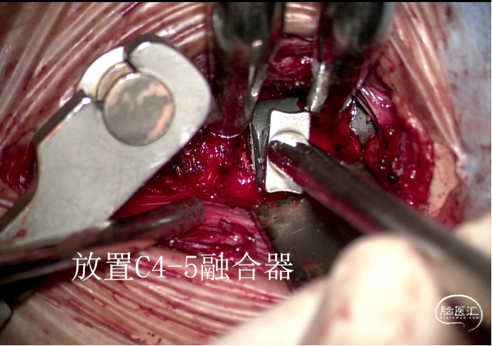 C4-5置入牵开钉,可见椎体只能容纳一个牵开钉宽度