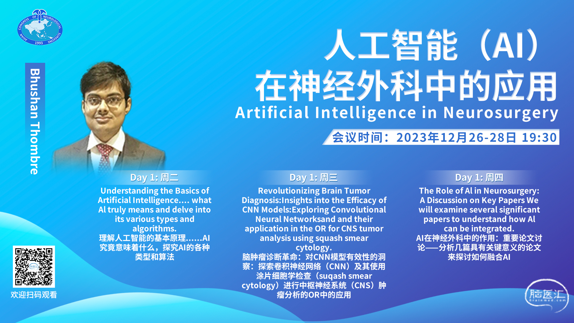 Bhushan Thombre——人工智能(AI)在神经外科中的应用,北京时间2023年12月26日-28日19:30直播,欢迎观看!