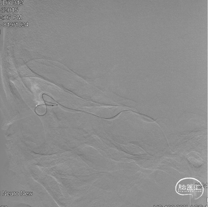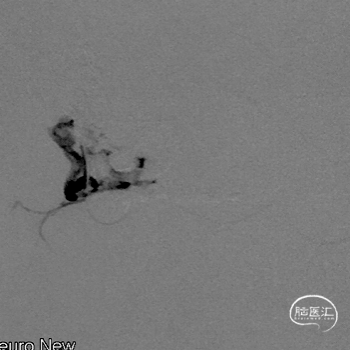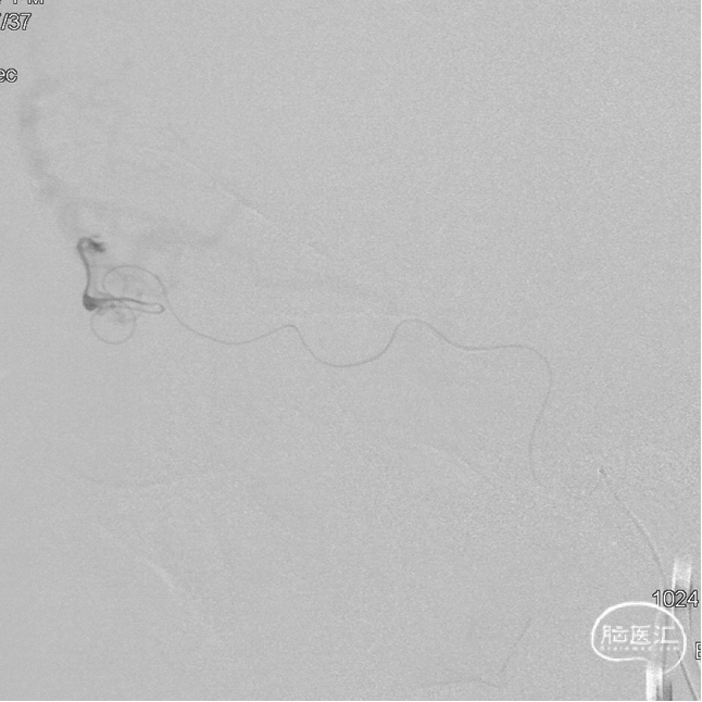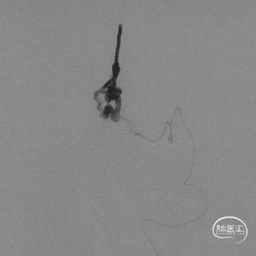 通过Marathon微导管超选造影,显示微导管楔入到靠近瘘口的动脉端。