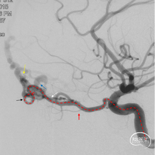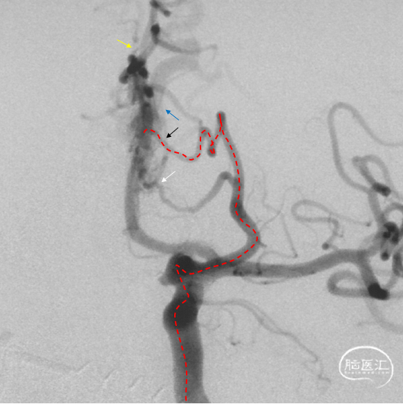 工作角度造影:黑色箭头为筛前动脉,白色箭头为筛后动脉,黄色箭头为镰前动脉,蓝色箭头为引流静脉起始部,红色箭头为视网膜中央动脉。拟通过眼动脉入路超选至筛前动脉进行栓塞。