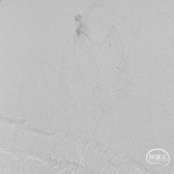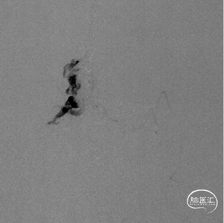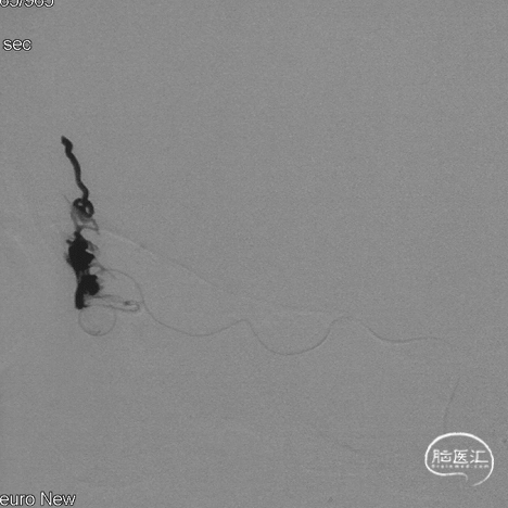 停顿后进一步注射Onyx18,此时胶向对侧筛前动脉弥散,直至闭塞瘘口和引流静脉起始端。