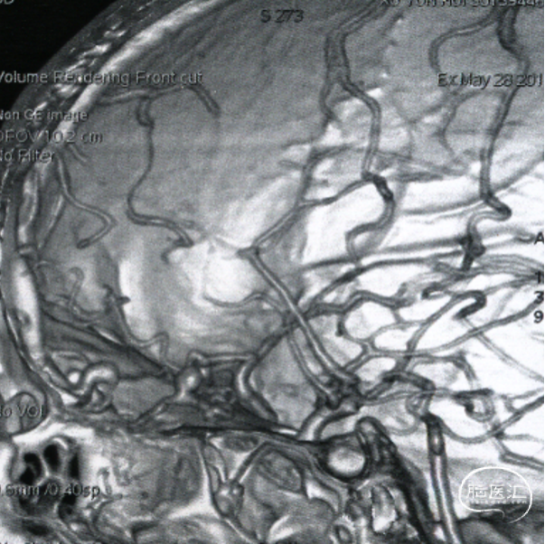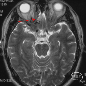MRA见额底部异常扩张的血管。