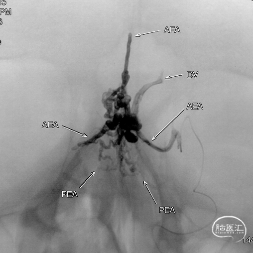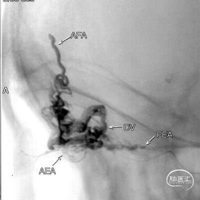 Onyx胶铸型进一步显示了瘘的结构。AFA:镰前动脉;AEA:筛前动脉;PEA:筛后动脉;DV:引流静脉。