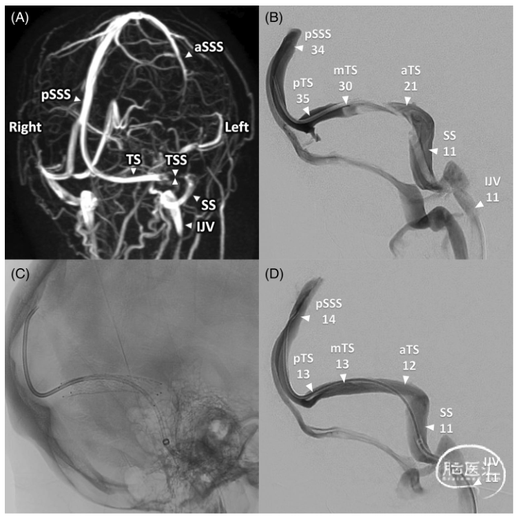 图1.(A)MRV的ATECO序列显示双侧横窦狭窄。aSSS,上矢状窦前段;IJV,颈内静脉;pSSS,上矢状窦后段;SS,乙状窦;TS,横窦;TSS,横窦狭窄。(B)支架植入前斜侧位静脉造影并测量压力(mmHg)。(C)沿左横窦狭窄段植入支架后的透视图像。(D)支架植入术后斜侧位静脉造影并测量压力。值得注意的是,在支架置入(B)之前,乙状窦(SS)和前横窦(aTS)之间有一个10mmHg的梯度,从21到11mmHg。支架植入术(D)后,从12到11mmHg的梯度仅为1mmHg。