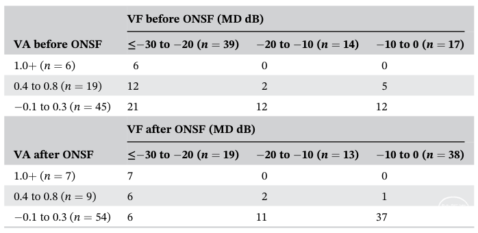 表1. ONSF前后每只眼睛的VF(MD dB)和VA(logMAR)。