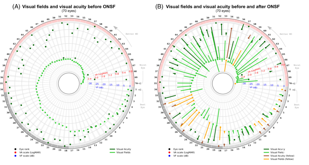 图2.(A)ONSF术前70只眼睛的视觉。VA(从0.0到2.4 logMAR)用深绿色圆点表示;VF(MD从0到-35dB)以浅绿色圆点表示。(B)单侧或双侧ONSF前后70只眼睛全部视觉。术前数据与(A)相同。