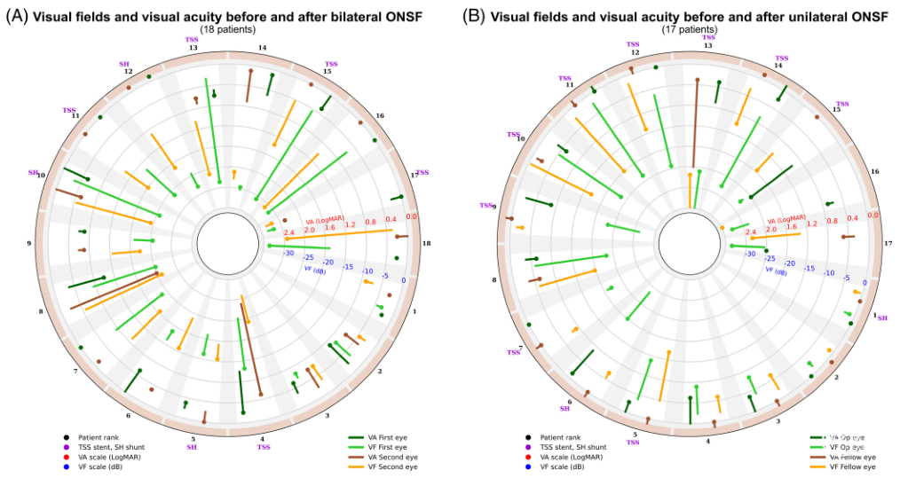 图3.(A)18例患者双侧ONSF前后的视力。第1只手术眼的VF(浅绿色)、VA(深绿色);第二只手术眼的VF(橙色)、VA(棕色)。ONSF之前的值用圆点表示;ONSF之后的变化用点延伸的线表示。(B)17例患者单侧ONSF前后的视力。与(A)相同,单侧ONSF治疗后,11/17的患者双眼VF得到改善。