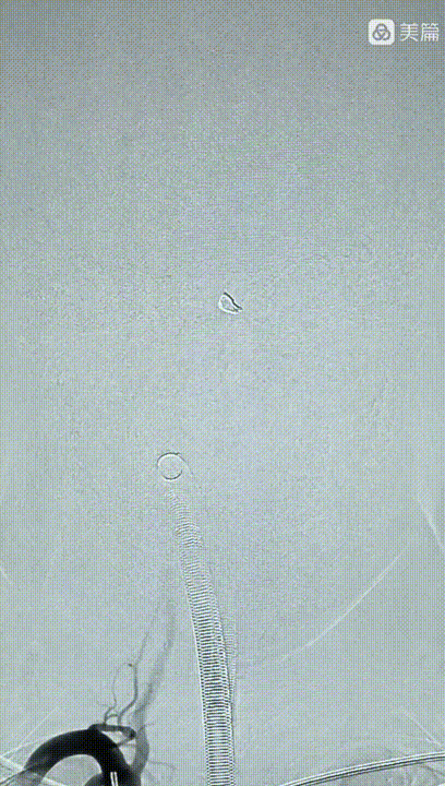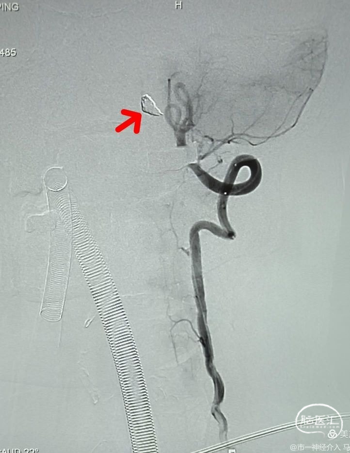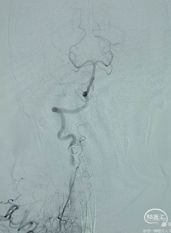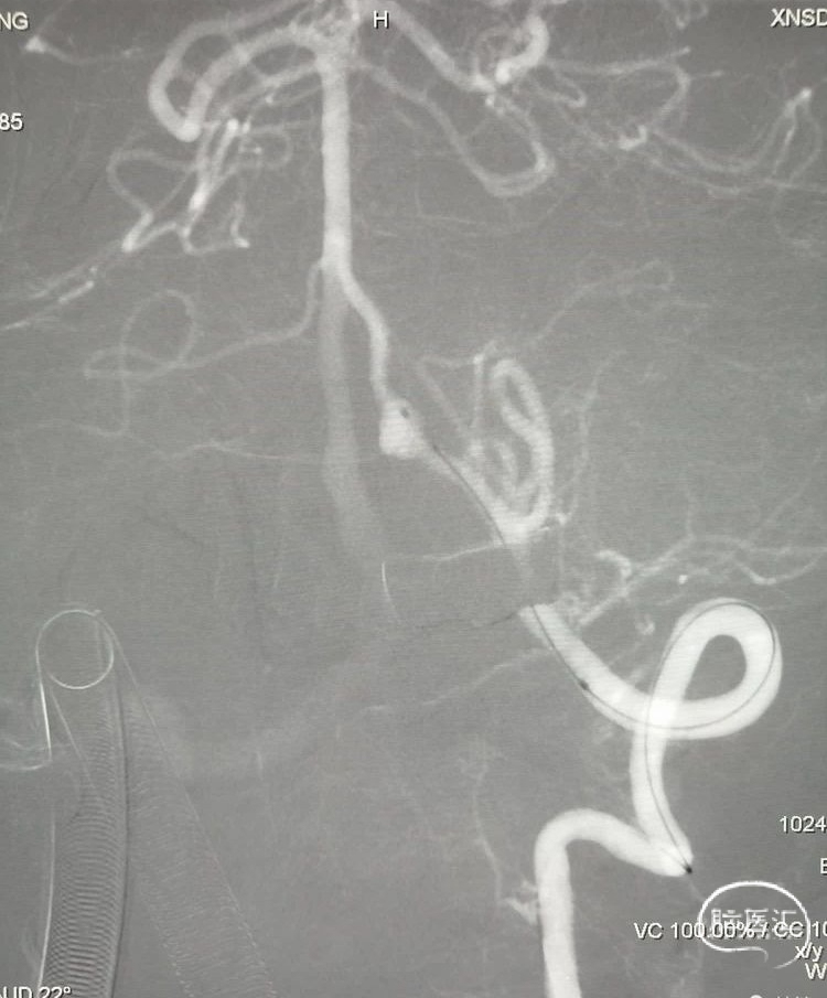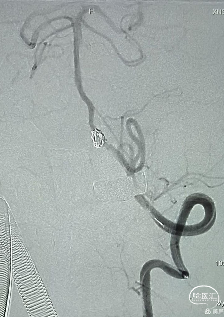 数枚弹簧圈进去,载瘤动脉及动脉瘤致密栓塞,小脑后下动脉显影良好,且有侧支与基底动脉近端联通。