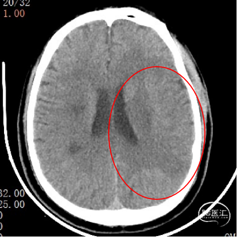 入院查体:意识模糊,失语,双侧向左凝视,右侧鼻唇沟变浅,伸舌不合作,口角向左歪斜,右侧肢体刺痛未见活动,NIHSS评分20分。