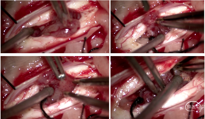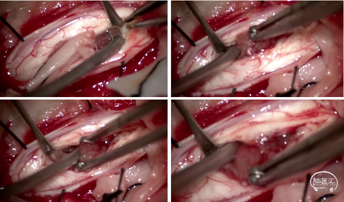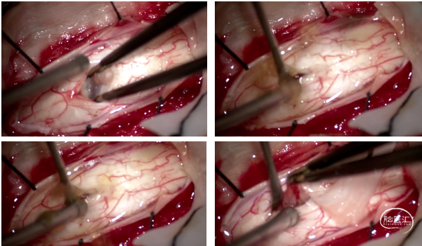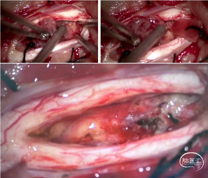 图2 术中情况:沿肿瘤两端分离,沿肿瘤边界分离,肿瘤切除后,脊髓中央管通畅,肿瘤全切。