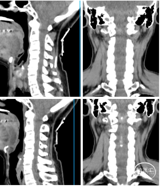 图1 颈椎CT及MRI示:脑干下份、C1-7及T1水平脊髓上份见异常信号,考虑室管膜瘤可能性大。