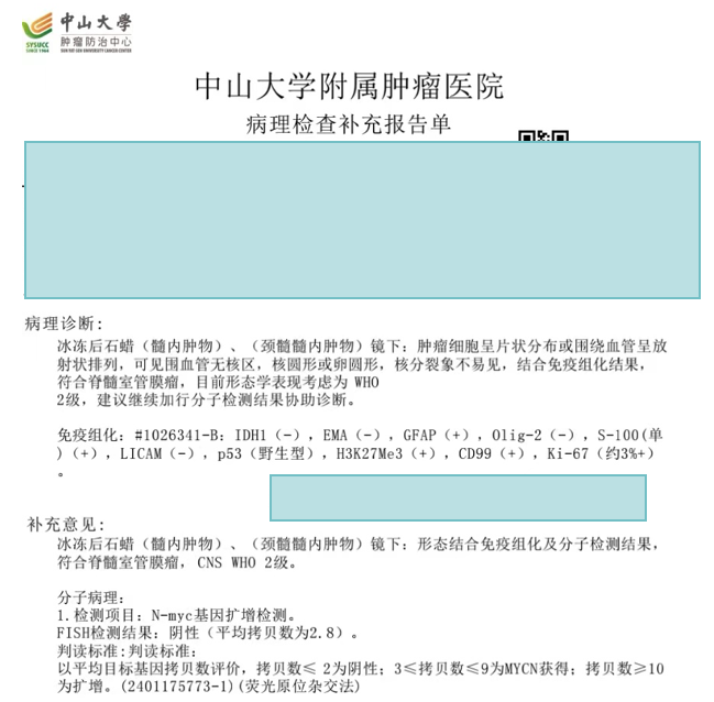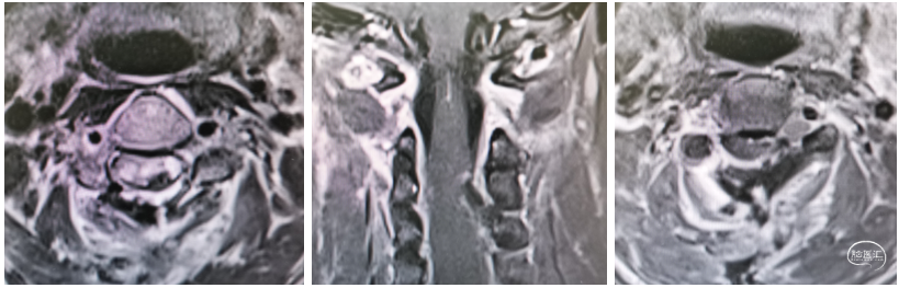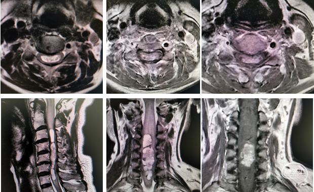 辅助检查:颈椎CT及MR示:脑干下份、C1-7水平脊髓上份见异常信号,累及长度约128mm,部分区域强化明显,内见病灶信号不均匀,增强见实性成分明显强化,相应水平脊髓肿胀等。