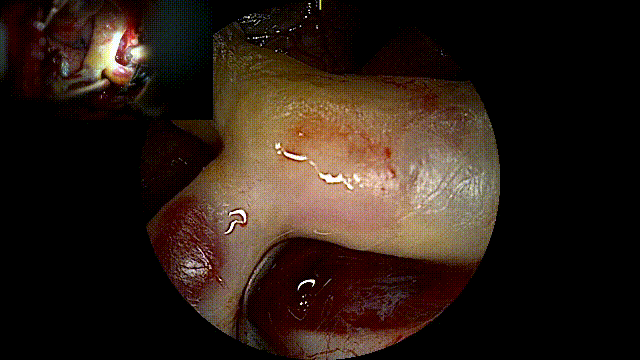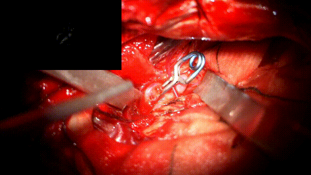A1段背侧的动脉瘤夹闭,瘤体虽然较小,但隐匿性较强,将动脉瘤夹闭后无法观察到背侧动脉瘤的所有细节,包括穿支血管以及瘤颈是否充分夹闭。当有了QEVO超微观察镜后可以快速清楚得看到深部被遮挡的解剖结构,确保动脉瘤被完全夹闭。这是传统显微手术中无法实现的。