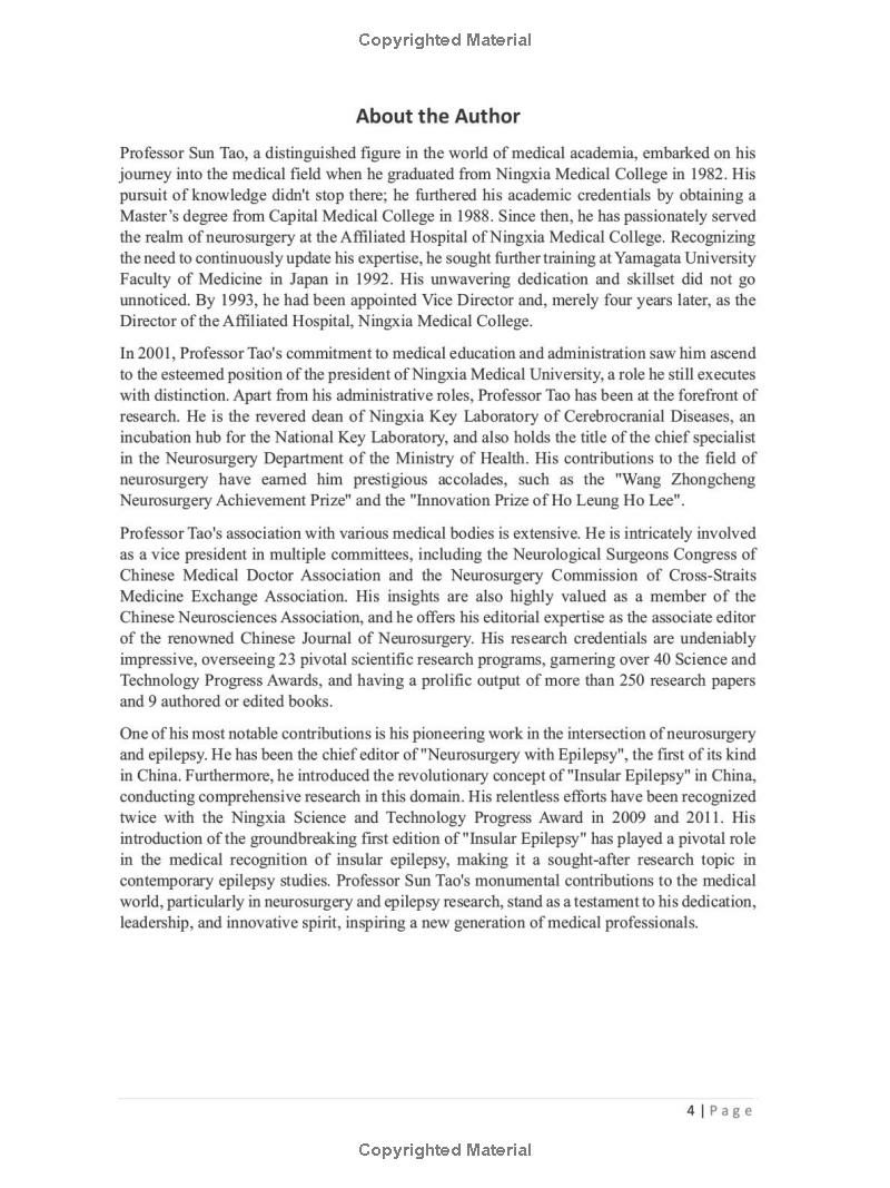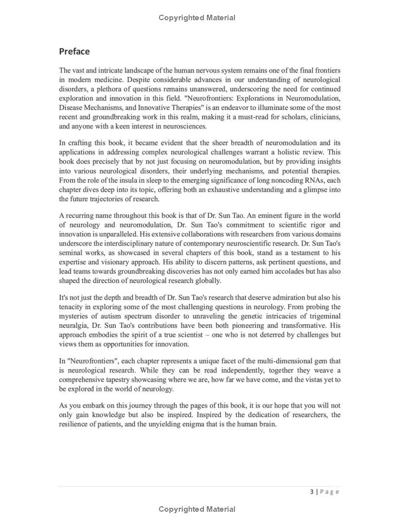 《神经调控、神经疾病与创新治疗的新见解》英文版于2024年1月18日由英国独立出版社正式出版发行。中国知名神经外科专家、宁夏医科大学孙涛教授致力于神经科学多年,特别是对功能神经外科造诣颇深。孙涛教授首次在国内提出了“岛叶癫痫”体系概念,针对岛叶癫痫环路、发病机制进行了基础与临床结合的系列研究,创新性地提出岛叶癫痫具有“独立性”和“复合性”的观点,积极开展岛叶区域病变的手术学及基础研究,引领颞-岛癫痫研究发展。此外,孙涛教授借助“宁夏脑计划”项目并综合应用基因工程、化学遗传和光遗传学、神经干细胞、3D打印、多模态神经成像等技术,在探索岛叶结构与功能、癫痫与脑认知障碍、癫痫治疗药物筛选等方面做了大量工作并取得了较大进展。近些年来孙涛教授团队,依托国家重点实验室培育基地,不仅对岛叶与癫痫、癫痫及基因突变之间的相关性进行深入研究,同时其团队对DBS靶向神经调控岛叶对神经系统疾病如自闭症谱系障碍、成瘾、VNS改善帕金森运动等疗效及机制的前沿探索亦取得了较大进展。孙涛教授分别于2021年12月3日、2023年2月9日全英文出版《Research Techniques In Neuroscience》、《Advances in Neurosurgery and Epilepsy》两本神经科学著作,均取得较大反响。《Emerging insights into Neuromodulation, Neurological Disorders, and Innovations in Treatment》的出版无疑是中国助力世界神经科学发展所贡献的再一份力量,启迪着新一代的神经科学研究者并为其指明潜在的前沿方向。
