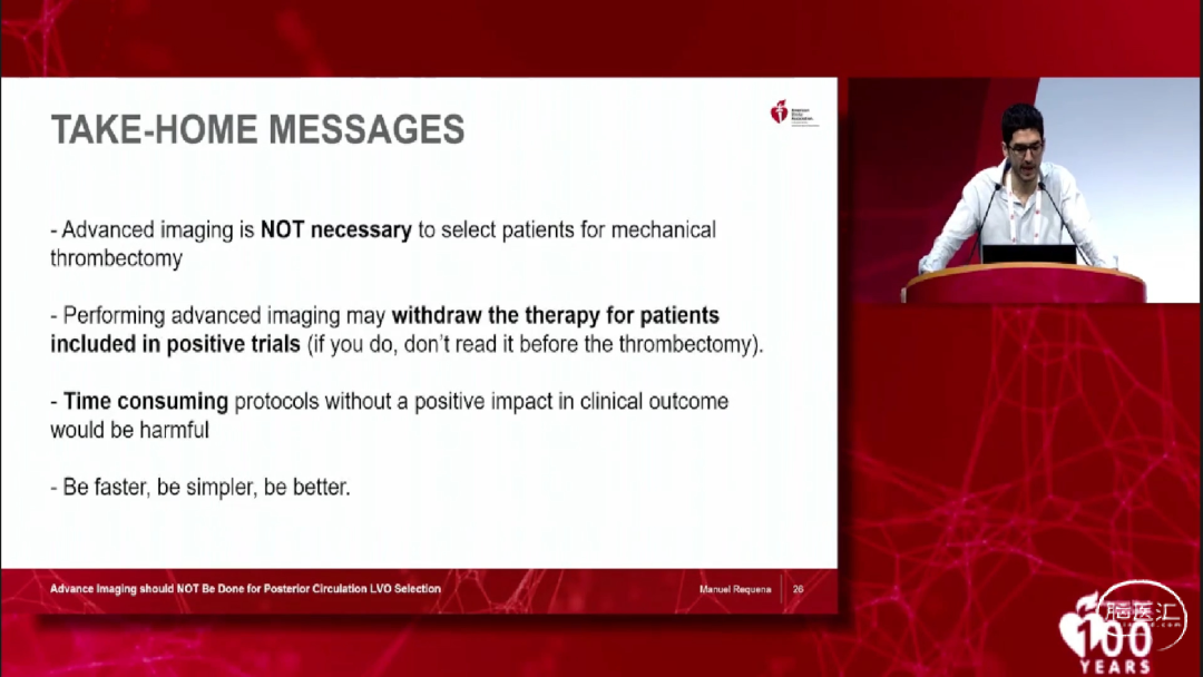 既然目前血管内治疗对于基底动脉闭塞的获益已经没有争论,那就没必要再去用高级影像学工具去筛选病人,我们应该想方设法去扩大血管内治疗的适应症,而不是通过高级影像学工具去缩小血管内治疗的适应症。