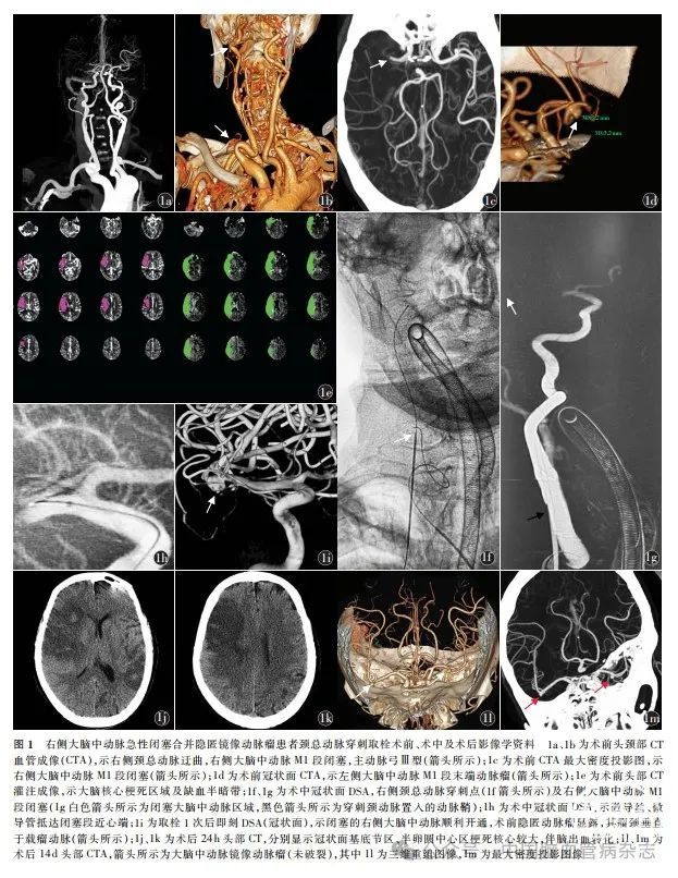 女,77岁,因“突发左侧肢体无力伴言语不能3 h”于2021年8月8日入住西南医科大学附属医院神经内科。入院前3 h,患者因突发左侧肢体无力伴言语不能就诊于赤水市人民医院神经内科,美国国立卫生研究院卒中量表(NIHSS)评分12分,予阿替普酶36 mg静脉溶栓后被送至西南医科大学附属医院神经内科,NIHSS 评分13 分(左上肢4分+左下肢4 分+语言2 分+面瘫2 分+感觉1 分)。既往高血压病史2 年,未规律服用降压药。急查血常规,红细胞计数3. 2 × 1012 / L,血红蛋白98 g / L,血小板计数103 ×109 / L,白细胞计数8. 66 × 109 / L,中性粒细胞计数7. 84 ×109 / L,中性粒细胞白细胞率90. 50%;心电图示心房颤动、快速心室率;Alberta 卒中项目早期CT 评分(Alberta stroke program early CT score,ASPECTS)6分;头颈部CT血管成像(CTA)示主动脉弓Ⅲ型,右侧颈动脉迂曲(图1a,1b),右侧大脑中动脉M1段闭塞(图1a,1c),左侧大脑中动脉M1段末端有1 个3. 2 mm × 3. 2 mm的动脉瘤(图1d);头部CT灌注(computed tomography perfusion,CTP)成像RAPID软件分析显示,核心梗死体积60 ml,缺血半暗带体积178 ml,失匹配比值3. 0(图1e)。患者符合血管内治疗适应证,无绝对禁忌证,获取家属诊疗知情同意书签字后于2021 年8 月8 日行急诊血管内治疗。全身麻醉,穿刺右侧股动脉,DSA显示腹主动脉、颈总动脉、颈内动脉迂曲,主动脉弓Ⅲ型,右侧大脑中动脉M1 段中段闭塞,残端呈“杯口征”。股动脉入路经多次尝试仍无法建立取栓手术的通路,考虑血管解剖路径不佳,遂改为穿刺颈总动脉。置入动脉鞘(6 F,Cordis,美国;图1f),通过动脉鞘送入中间导管(125 cm,5 F,EV3,美国),通过中间导管造影再次确认大脑中动脉闭塞(图1g)。将微导丝(200 cm,Avigo,EV3,美国)及微导管(153 cm,Rebar-18,EV3,美国)送至闭塞段近心端(图1h),并经造影确认在血管真腔。通过微导管送入取栓支架(4 mm × 20 mm,Solitaire FR,EV3,美国),在中间导管辅助下抽拉结合取栓1 次,血管再通,并在原闭塞大脑中动脉末端暴露1个3 mm × 4 mm的隐匿动脉瘤,瘤颈垂直于载瘤动脉,向下方生长(图1i)。颈总动脉穿刺点通过血管封堵器(6 F,Cordis,美国)止血。原闭塞右侧大脑中动脉末端的镜像动脉瘤未进行处理。术后24 h复查头部CT,可见脑梗死合并少量脑出血转化(图1j,1k),继续观察。术后9 d出院,出院时NIHSS评分8分,患者回当地医院进行康复治疗。术后14 d复查头部CTA,提示镜像动脉瘤未破裂(图1l,1m)。术后3个月门诊随访,改良Rankin量表(mRS)评分3 分。术后1、2年进行电话随访,mRS评分分别为2、1分。